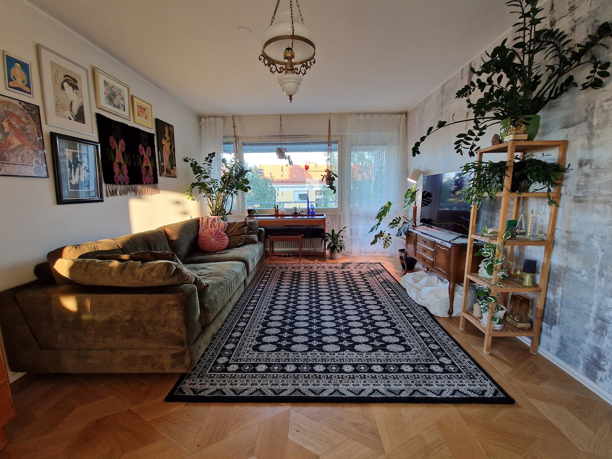 Stylish and spacious apartment at the most central location in Turku; by the market squire, with restaurants, shops, museums and bus stops just at your doorstep. Also the river is just a block away. Well equipped, design details, fully renovated in 2023! We offer a double bed (160x200 cm) in the bedroom, and a sofa bed (90x180 cm) and thick additional travel bed upon request..