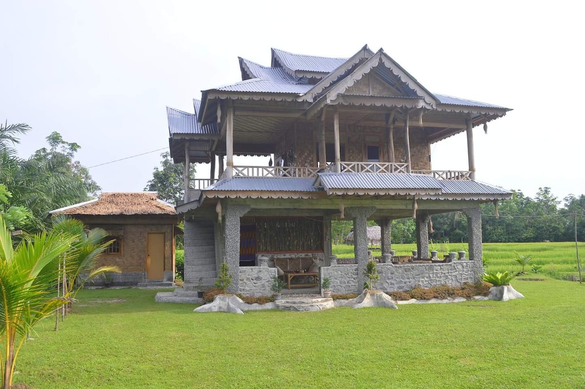 Es una casa de piedra, bambu y madera. Construida 100% a mano con materiales locales en 2015. Esta en medio de una plantacion de arroz en la zona rural de Bukit Lawang y a tan solo 10 minutos a pie de la estacion de autobuses. Perfecta para relajarse en pareja o amigos. Tiene vistas a la montaña, al atardecer y al amanecer. Una casa unica y autentica en Bukit Lawang