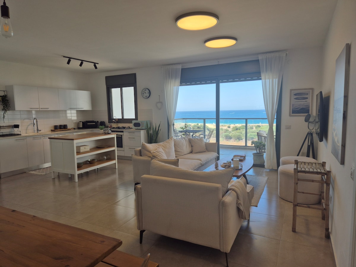Vive la libertad frente a un azul interminable Apartamento vacacional en Achziv a pocos pasos de 200 metros de la playa, Achziv Beach se considera con razón la playa especial y hermosa de Israel, Millas de hermosa playa relajante playa abierta, lagunas, vegetación especial, reserva natural de aire limpio, olor a mar, canto de pájaros y gritos de gaviota. Despiértate con un increíble amanecer y relájate con una impresionante puesta de sol. El apartamento es lujoso y tiene aire acondicionado y está equipado con 4 dormitorios, sala de estar, cocina, comedor, gran balcón en un piso alto y espacioso con vistas al mar.