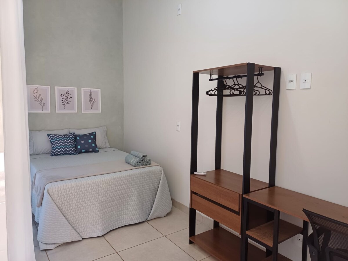 Sejam bem vindos! Imóvel simples e aconchegante, localizado em bairro residencial seguro e arborizado. Local ideal para quem busca tranquilidade, conexão com a natureza e principalmente privacidade. Sintam-se, em casa! Saliento que o ar condicionado da sala/cozinha não tem capacidade para refrigerar todo o ambiente, a função dele é somente para amenizar o calor. O do quarto sim, é para atender e refrigerar adequadamente o ambiente.
