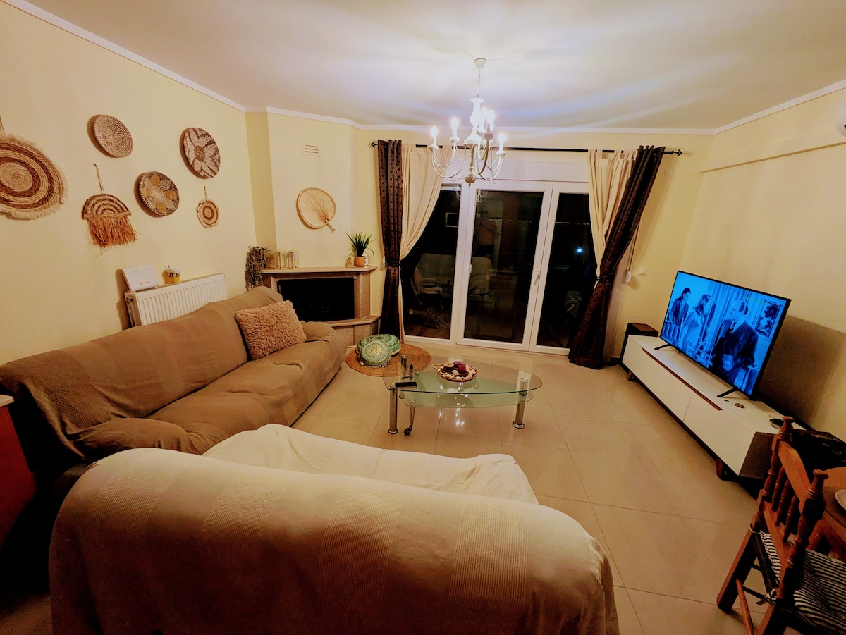 Our unique apartment is located on the second floor of a dreamy house in Epanomi. It is a 3' car ride from the beach, in a quiet neighborhood. You will enjoy the view of Olympus mountain, the sea and the sunset! A super comfy bed, a cozy sofa bed for two, a beautifully designed space with a jacuzzi, a huge balcony, an amazing garden and barbecue, safe parking, are some of the amenities. Epanomi is very closed to Thessaliniki and Makedonia airport!