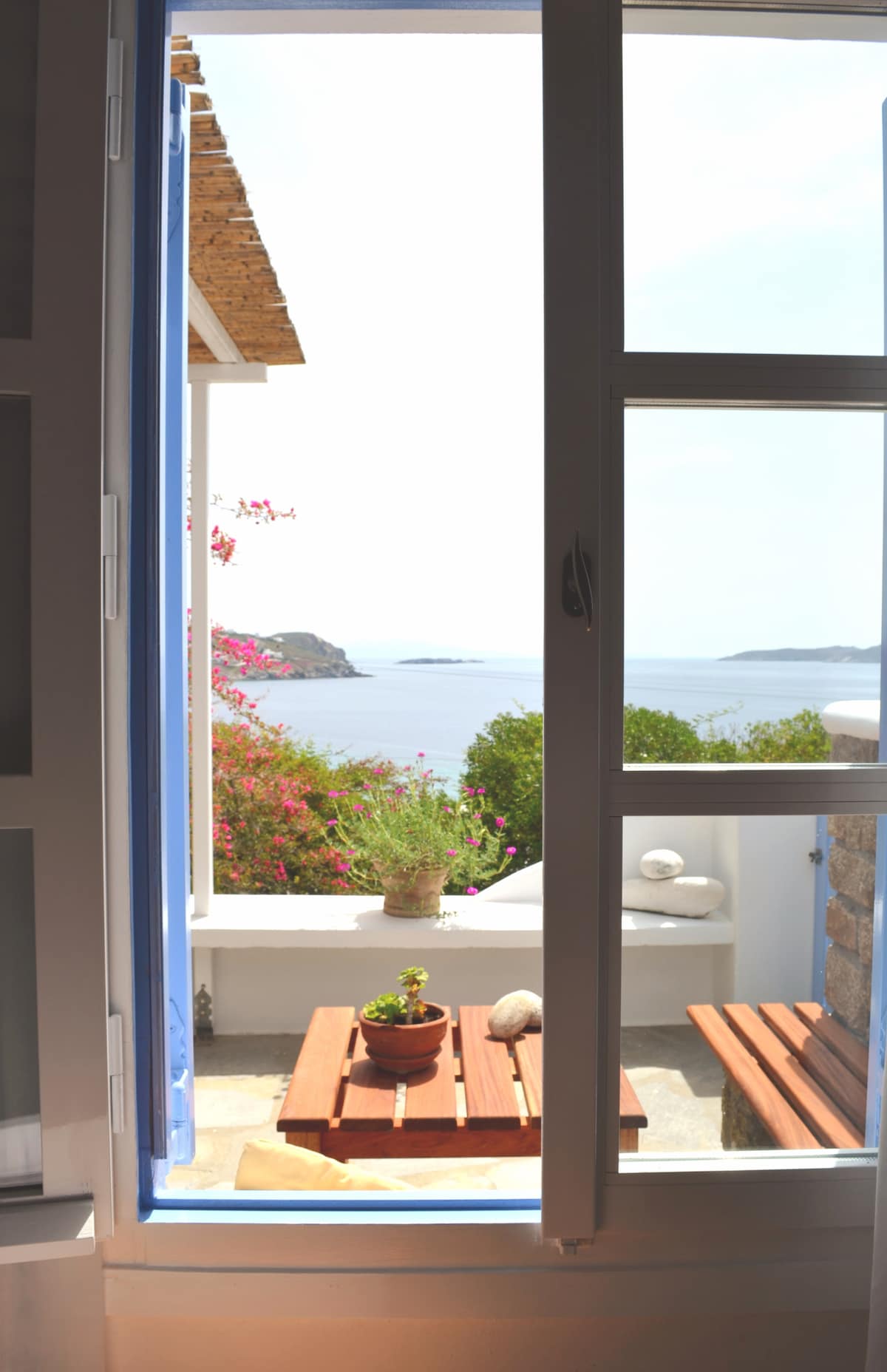D'Angelo Hilltop Oasis is a newly renovated private property located at the edge of Mykonos Town. Positioned in a quiet neighbourhood, providing a beautiful view of the Aegean Sea and Mykonos Town. Nestled into a beautiful natural hillside surrounded by traditional gardens, all while maintaining the convenience of being in town. Perfectly located, a short 5-7 minute walk is all that stands between you and the historical centre and Fabrika square (downhill there, uphill on the way back).
