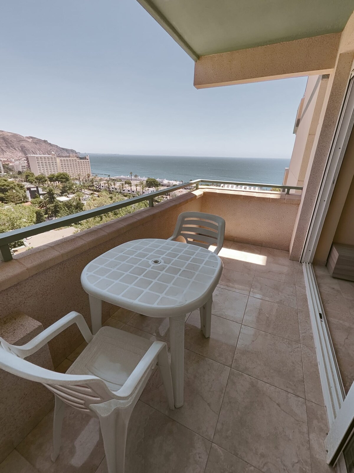 Estudio muy luminoso con impresionantes vistas, a 250 metros de la playa. Con vistas al mar y a la montaña. Balcón espectacular para el verano, se ve el amanecer y por las tardes da la sombra. Ideal para comer y cenar. Cuenta con todas las comodidades, cocina completa (con microondas, tostadora, placa de inducción, etc.), aire acondicionado con bomba de calor, lavadora, nevera, tv, mesa y sillas tanto dentro del estudio como en la terraza.