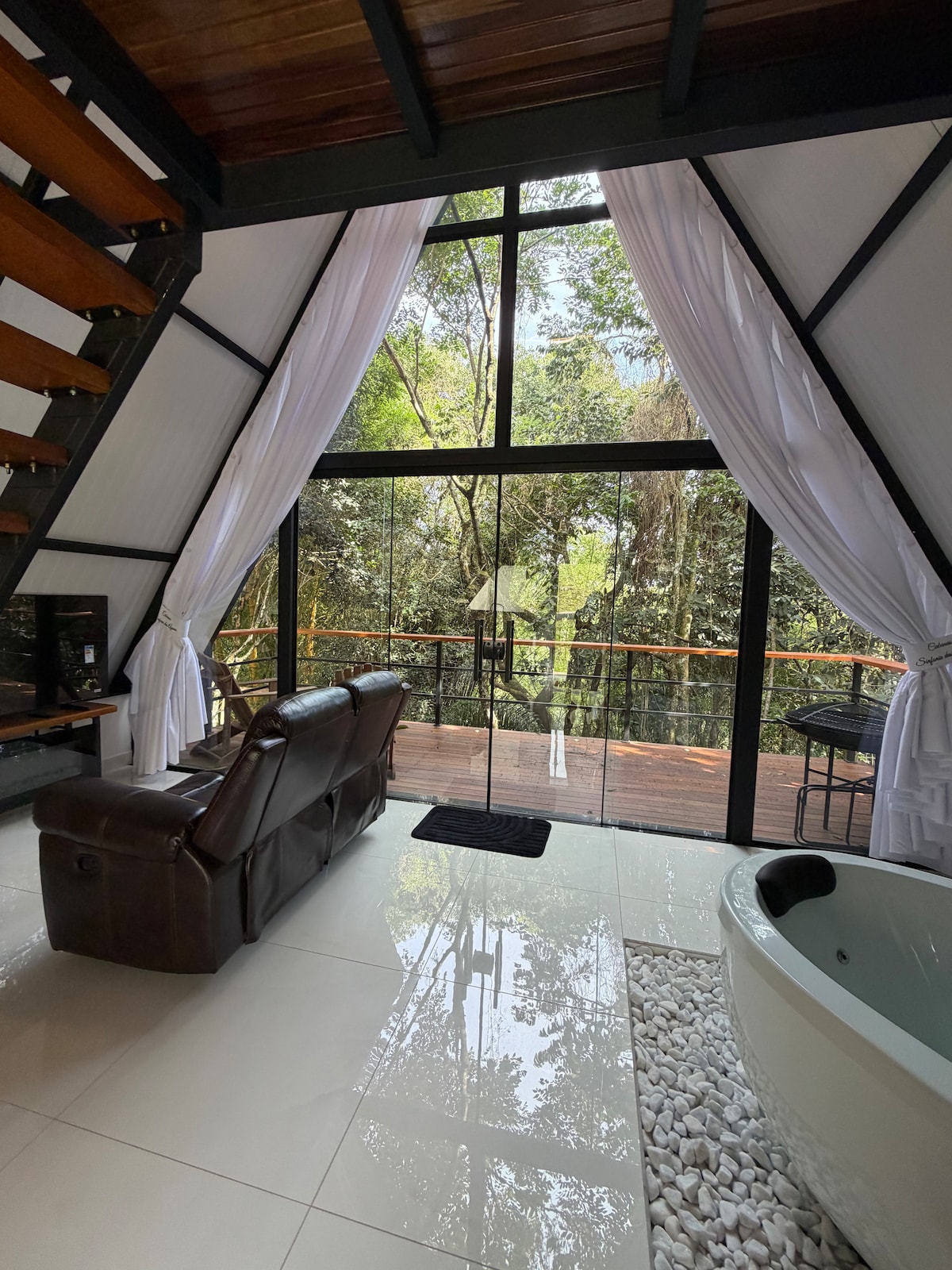 Chalet de mampostería de 40 m²; 1 habitación de 9 m²; cama doble; TV de 21''(LED); fire stick, DVD; ventilador de techo; sala de estar; mini cocina equipada (platos, vasos y utensilios); microondas; minibar; cafetera; sandwichera; cocina eléctrica de 2 hornillas; chimenea; balcón de 10 m²; capacidad para 2 personas. En la propiedad, sala de juegos, sala de estar, piscina, senderos, masaje, lago para pesca deportiva, cocina compartida, hamacas, naturaleza al pie de la Serra da Mantiqueira.