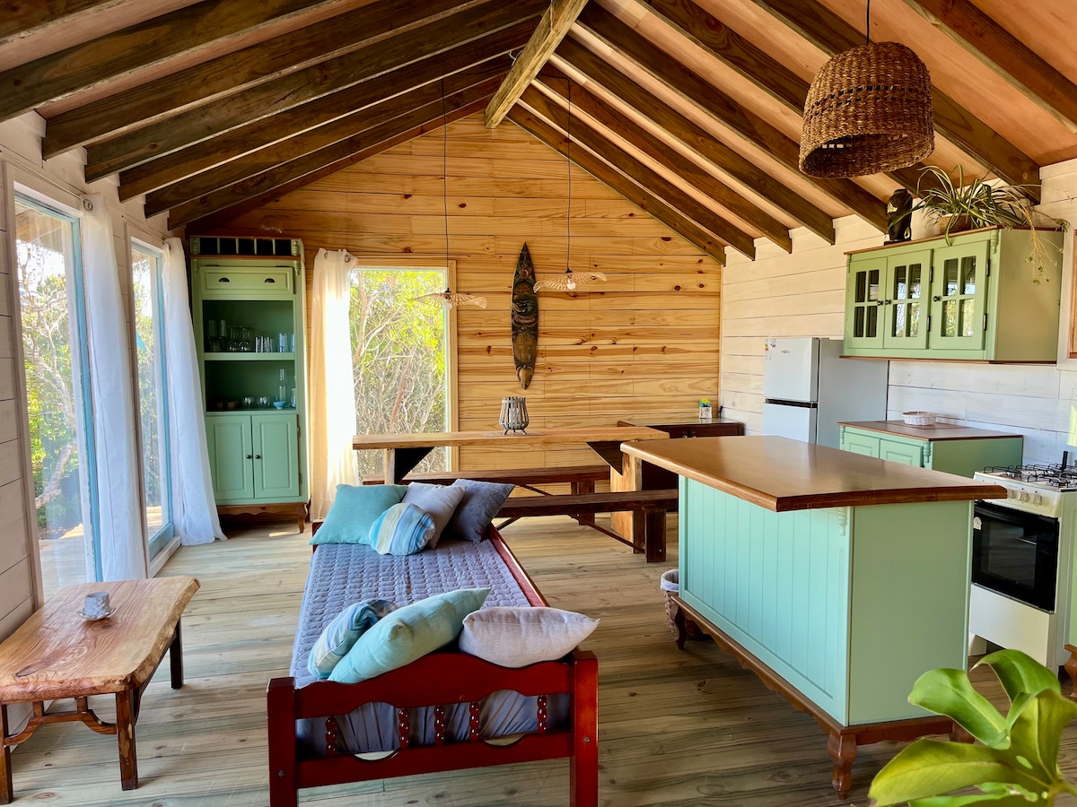 El alojamiento tiene tres cabañas rodeadas de naturaleza en una zona muy tranquila a 800 m a pie de playa La Viuda , decoradas con objetos de diseño de nuestra autoría y pensadas para el disfrute de nuestros huéspedes. Dos cabañas en madera, ideal para parejas y familia, capacidad hasta 4 personas. Un monoambiente con baño y terraza privada en contenedor marítimo, ideal para parejas. Atención personalizada y privacidad garantizada. Gracias por elegirnos! Fabiana y Miguel