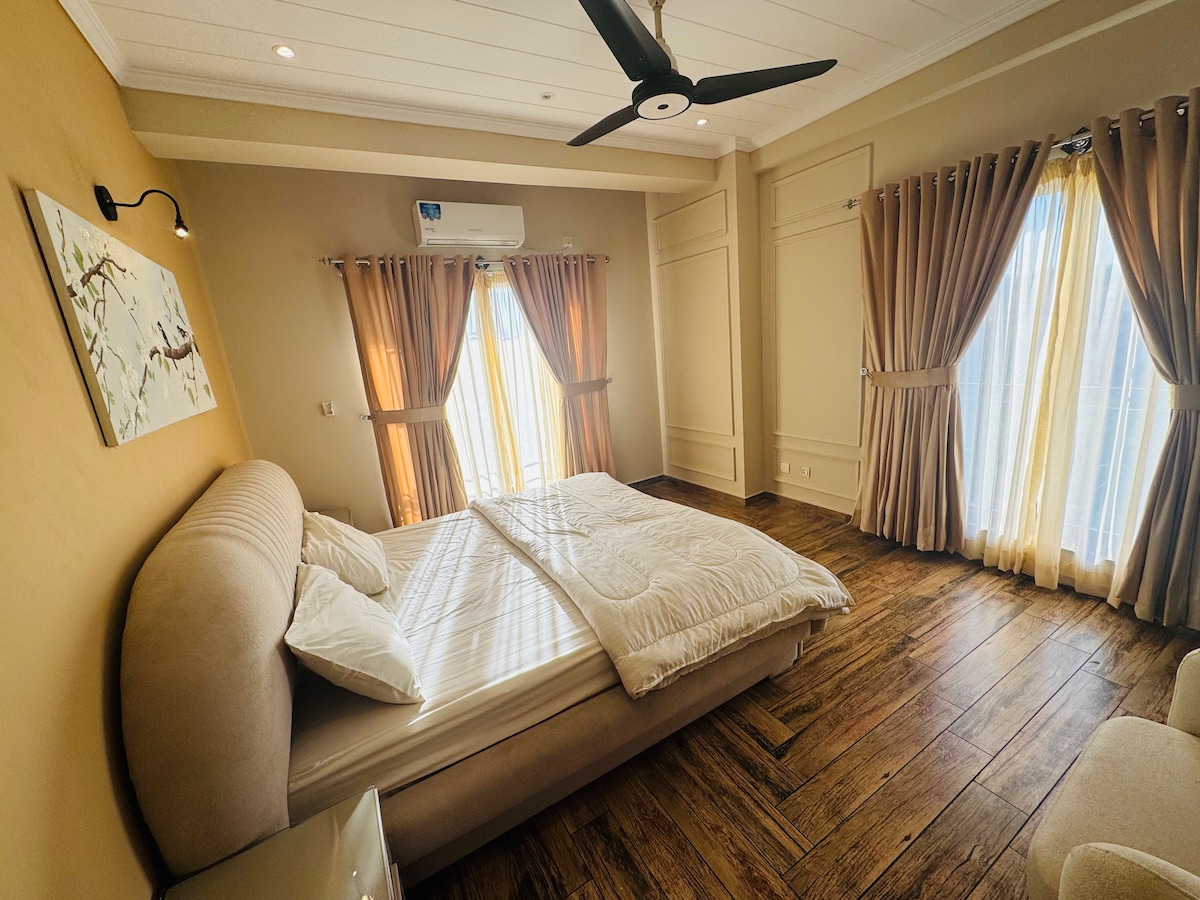 Experimentá la serenidad en un departamento de esquina de 2BHK con temática Japandi, ubicado idealmente en el corazón del centro de Islamabad. El espacioso departamento (1710 pies cuadrados) cuenta con un minimalismo moderno, dos balcones privados con vistas panorámicas de las colinas de Margalla y Gulberg Greens, camas cómodas, espacio de trabajo dedicado, wifi de 40 mbps, un cine en casa para noches de cine acogedoras, juegos de mesa y una cocina abierta totalmente equipada para cocinar tu comida favorita. ¡Perfecto para familias, amigos o trabajadores remotos!