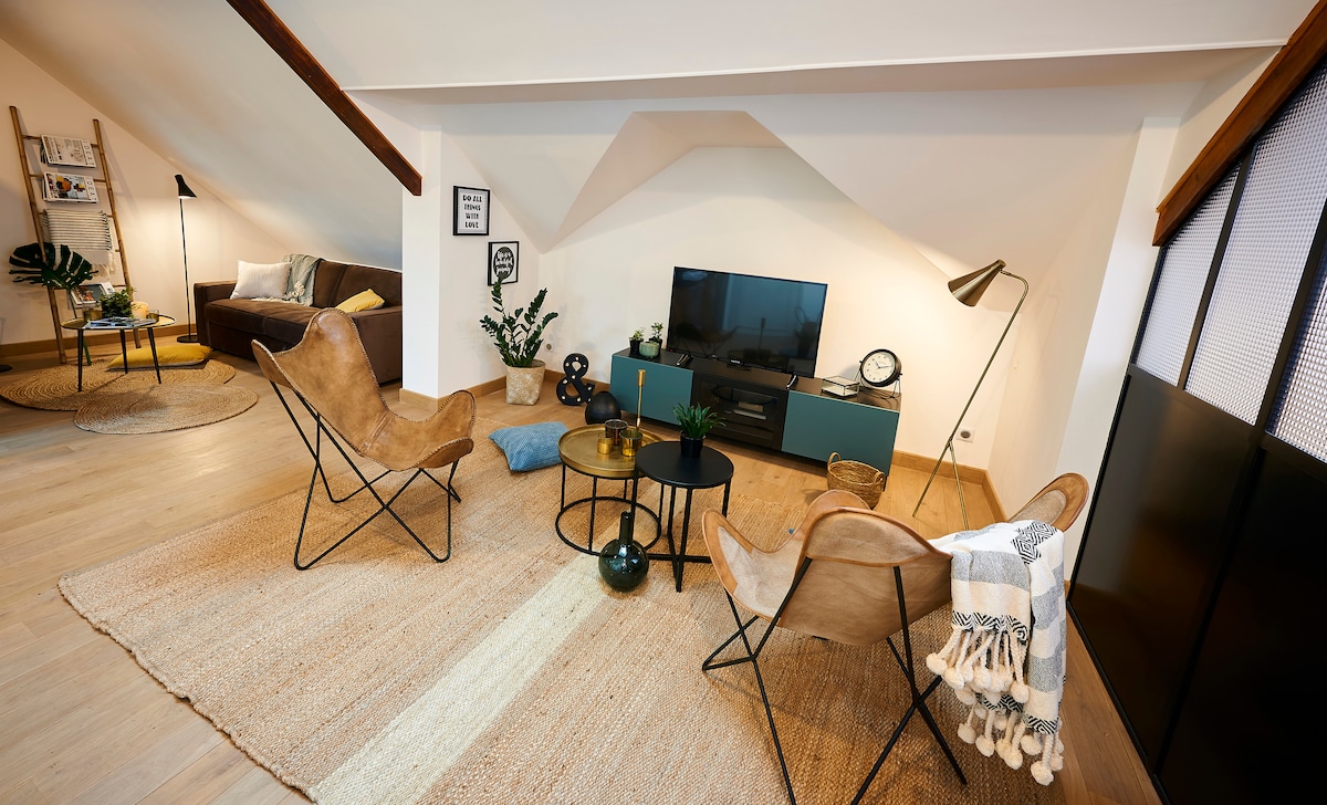 🚩 Bienvenue au Loft ! 🎁 Une bouteille de champagne offerte en cadeau de bienvenue 🥂🍾 🏠↔️Très spacieux, Loft de 150 m2 💤 Calme et confortable 🤴 Lit King Size 👸 Lit Queen Size 🛋️ Canapé convertible 🧖♀️🫧 Baignoire balnéo dans la salle de bain pour vous détendre 📽️🛋️ Vidéoprojecteur 4K dans le salon, comme au cinéma 🅿️🚘 Parking gratuit, privé et sécurisé sur place. Largeur : 2m25. Longeur 4m90. Hauteur : 2m00 🎅 Le marché de Noël en décembre est à 15 minutes à pied