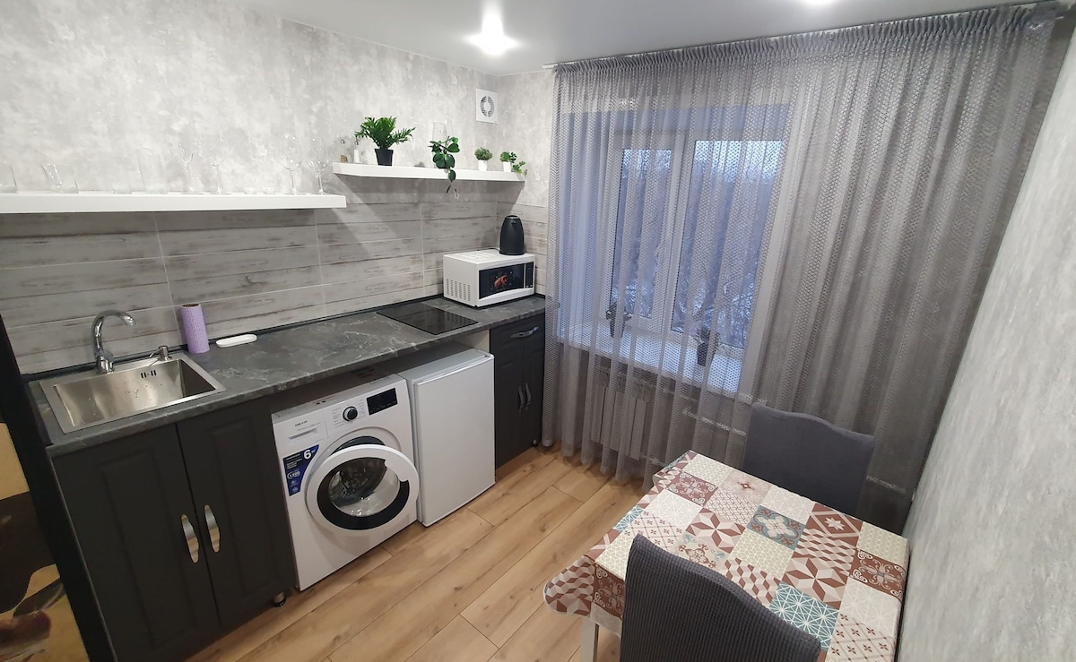 Un acogedor departamento con nueva renovación de calidad y diseño elegante se encuentra en el centro de la ciudad. Hermosa vista a la ciudad. En la casa donde se encuentra el apartamento hay una tienda Remix. El propietario del apartamento está disponible las 24 horas del día. El apartamento está perfectamente limpio. Sábanas y toallas pastel de alta calidad (para manos, cara y pies). El apartamento también está equipado con zapatillas desechables, juegos de dientes, internet rápido y Smart TV, en una gran televisión de alta calidad. La limpieza se realiza diariamente y de gran calidad.