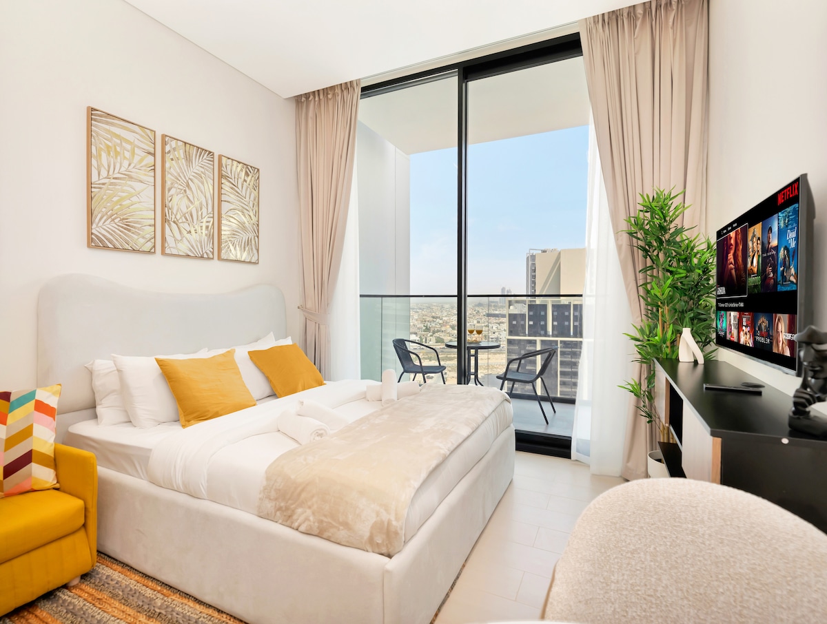 YieldStay: Estudio elegante con balcón | Pileta • Gimnasio Estudio moderno en JVC, Dubái, con balcón privado. Cama queen, TV inteligente, wifi y cocina pequeña. Disfruta de los servicios de estilo resort: piscina al aire libre gimnasio sauna Seguridad las 24 horas, los 7 días de la semana, y supermercado en el lugar. Ubicación privilegiada cerca: Centro comercial Circle Miracle Garden Global Village y Autódromo de Dubái. Adicionales: Estacionamiento gratuito. No se admiten mascotas ni se puede fumar en el interior. Ideal para parejas. Personas que viajan solas y huéspedes de negocios.