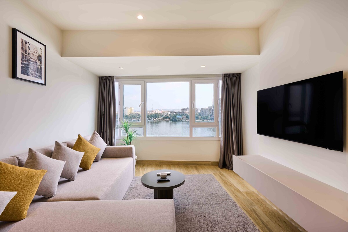 Experience luxury living in this modern 1-bedroom hotel apartment located inside Hilton Maadi on the Nile Corniche. Enjoy a private balcony with direct Nile views, a spacious living area with Smart TV + Netflix, a fully equipped kitchen, and hotel-style linens. You’re steps from cafés, restaurants, hotel pools, and services, and Only 20 minutes from Giza Pyramids and Downtown Cairo. Perfect for business travelers, couples, and long or short stays. Smoking allowed in balcony. Book Now!