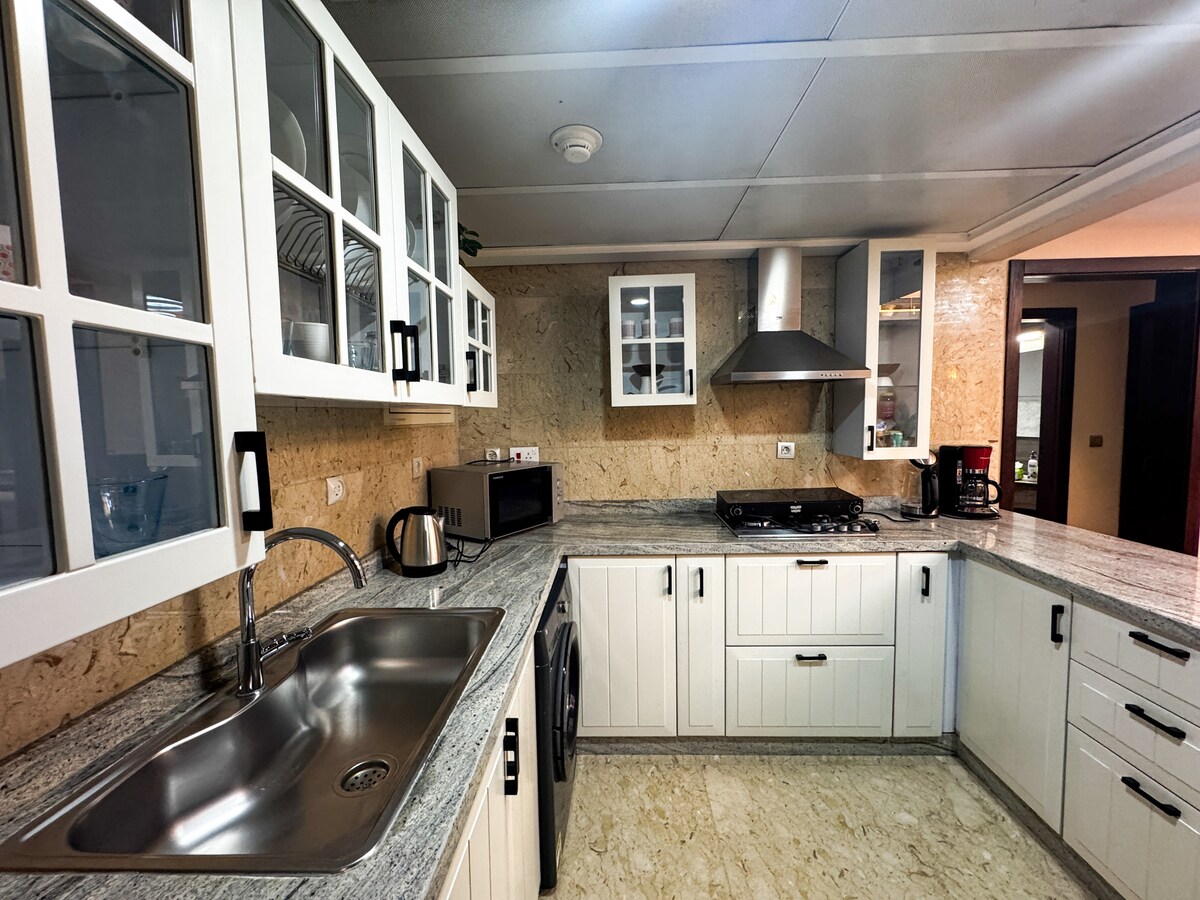 apartamento completo con aire acondicionado y aislado de sonido que consta de 4 dormitorios, 8 camas, 2 sofás, 2 baños, 1 sala de estar y mesa de comedor, 1 cocina. Las habitaciones están equipadas con los más altos estándares. La cocina está completa con todos los electrodomésticos, utensilios de cocina, alimentos, platos y tazas. Ofrecemos sábanas y mantas gratuitas por adulto, así como papel higiénico y toallas gratuitas. En todas nuestras habitaciones de invitados, nuestras habitaciones son grandes, limpias y completamente nuevas.
