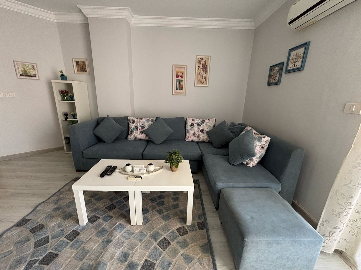 Las características del espacioso departamento 2 dormitorios con dormitorio principal , 2 baños, ropa de cama, toallas, 2 televisores inteligentes con servicios de streaming, un comedor, una cocina totalmente equipada y una terraza con vista al jardín. Llegada autónoma con cerradura inteligente. 📍 Wifi y estacionamiento disponibles. Cerca de 2 de los supermercados más famosos ‘Seodi y Mahmoud el Far’ y cafeterías Como anfitrión dedicado, me aseguro de ofrecerte la más cómoda y de la mejor calidad. Con una limpieza de alta calidad, te sentirás como en casa.
