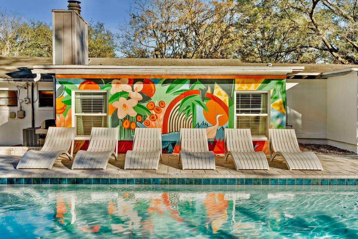 Welcome to your perfect Gainesville getaway! This stunning 3-bedroom, 2-bathroom home boasts a central location just minutes from the UF stadium. The dens are share a connecting space, they do not have separate doors. Featuring a seamless blend of mid-century modern design, tropical Florida charm, and tasteful Gator-inspired accents, it offers a unique and comfortable stay for any occasion. Plus, enjoy modern conveniences like a Tesla charger, making it perfect for eco-conscious travelers.