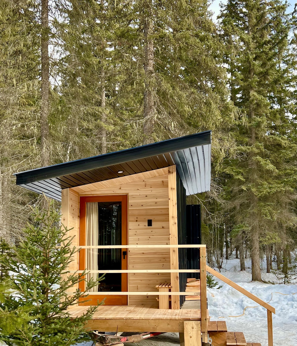 This little Nordic inspired cabin is close to everything but in a peaceful spot just outside of town, walking distance from the Golden Sky Bridge, 5 min ride into the centre of town, and 15 min to Kickinghorse Ski Resort. This beautiful cabin has a two-burner cooktop stowed away to cook your own meals and a mini wood-burning stove to keep you cozy. The Nordic Cabin has everything you need in a small cozy footprint. The perfect place to rest and rejuvenate after your Golden adventure. Enjoy!