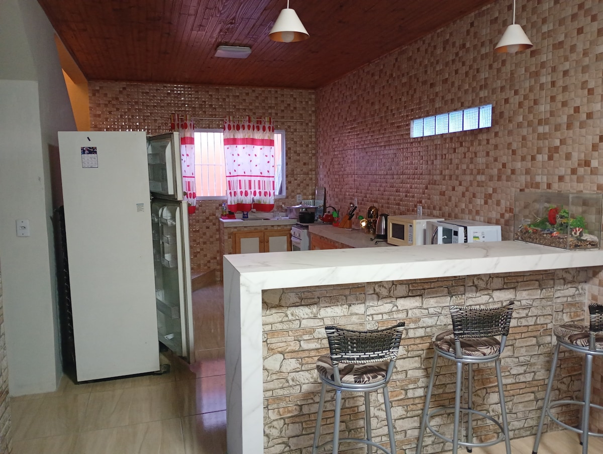 ¡Casa completa! Sala de estar con TV de 40 pulgadas, TV box, cómodo sofá; 1 dormitorio con cama doble con aire acondicionado, 1 dormitorio con cama doble y 1 cama individual con aire acondicionado, 1 dormitorio con una cama individual con cama supletoria y una cama individual con aire acondicionado; sábanas y mantas disponibles; 1 baño con ducha; cocina completa con freidora eléctrica, horno eléctrico, microondas, platos para 8 personas, cafetera, sandwichera, lavadora; garaje cubierto; enorme patio con cámara externa para tu seguridad; alarma interna.