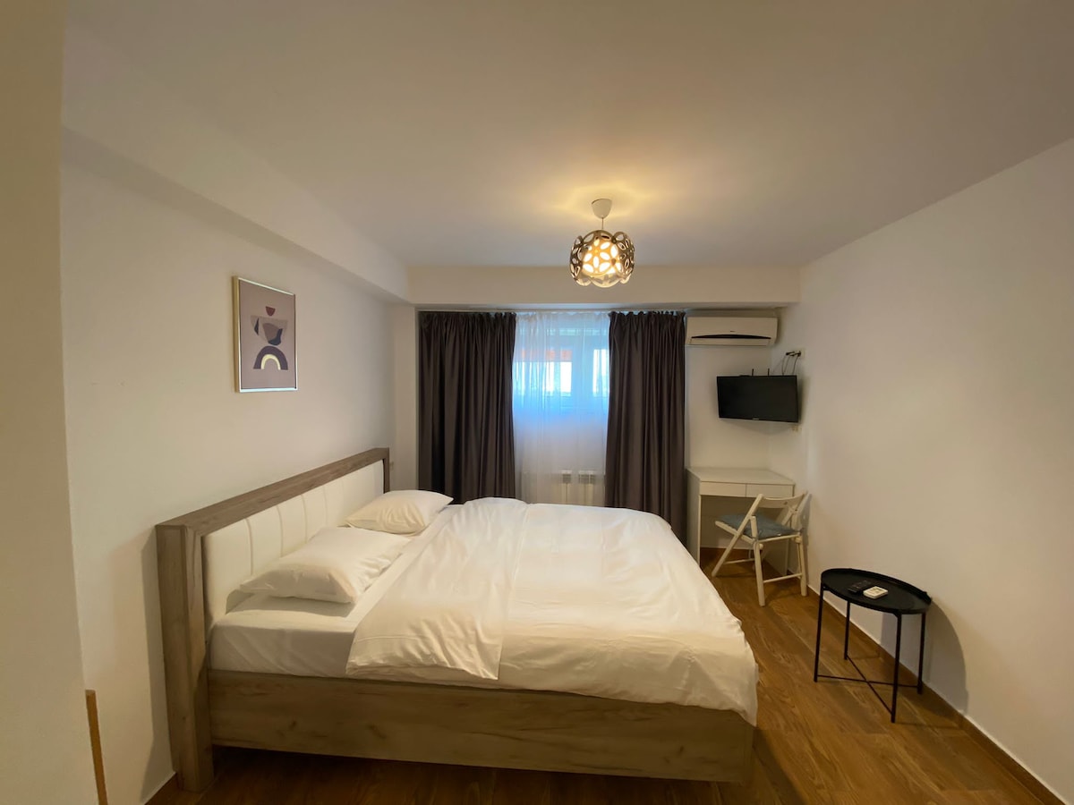 Un estudio a estrenar, fresco, limpio, con un diseño moderno y una vista increíble sobre la ciudad, ubicado en un nuevo complejo residencial. El estudio se encuentra a solo 4 minutos a pie de la estación de metro 1 Decembrie 1918, junto al edificio tenemos el supermercado Lidl, el Auditorio Pallady y fácil acceso a la autopista A2. También hay aparcamiento subterráneo gratuito disponible durante tu estancia. Dentro del acogedor estudio tenemos TV inteligente con Netflix, wifi gratuito y otros artículos necesarios para que tu estancia sea perfecta.