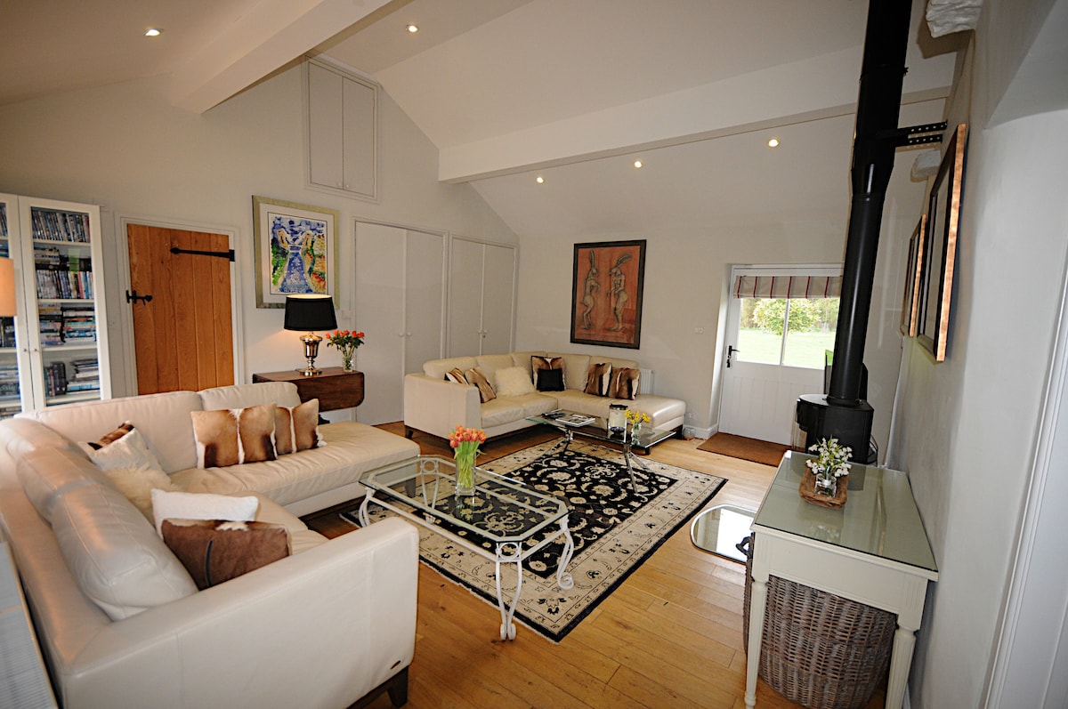 Vuelve a conectar con la naturaleza en esta lujosa cabaña ubicada en una tranquila aldea. Encuentra tranquilidad en la terraza rodeada de impresionantes vistas o relájate en medio de una decoración cuidadosa y elegantes acabados modernos en el interior de vigas de roble a la vista. ¡Blue Vale es nuevo a partir de junio de 2018! Ayudamos a diseñar este edificio con estructura de roble verde y hemos participado en todo el proceso de construcción, haciendo gran parte nosotros mismos. Para nuestra combinación de colores hemos utilizado diferentes tonos de azul en todo momento, jugando con el nombre de Blue Vale. El mobiliario y los toques finales son de alto nivel para ayudar a promover un acabado cómodo y lujoso. Hay un estilo ecléctico que combina el campo moderno con acabados industriales. La ropa de cama y las toallas de algodón de lujo de hilo alto, los televisores inteligentes de pantalla plana grandes y los artículos de aseo de lujo de Neals Yard ayudan a dar los toques finales de alta gama que apreciaríamos si nos quedáramos lejos de casa. Blue Vale es completamente independiente, pero se encuentra en los terrenos de nuestra casa familiar. La sala de estar al aire libre está protegida por un enrejado en el lado del jardín con campos en el otro. Te invitamos a pasear por nuestro jardín. Podemos ser tan interactivos como quieras. Al vivir en los mismos terrenos, estamos cerca si es necesario. Te daremos la bienvenida cuando llegues, pero respetaremos tu privacidad. El glorioso paisaje de Blackmore Vale es un tapiz de campos verdes cultivados con una pizca de pueblos ingleses, de los cuales Sandley es uno. Salga a caminar (o en bicicleta, utilizando nuestras bicicletas disponibles) por los carriles del país y aventúrese a lo largo de una red de senderos para descubrir esta parte virgen de Dorset. Visita Stourhead, pasea por las antiguas ciudades de Sherborne o Shaftesbury o descubre la hermosa costa jurásica. Visita el parque safari Longleat, el Museo del Motor Haynes, Monkey World y el Museo del Aire de Yeovilton. Sandley es una aldea tranquila con el pueblo vecino de Buckhorn Weston a solo una milla de distancia. Aquí se encuentra el pub Stapleton Arms. Estamos a 10 minutos de las ciudades de Gillingham y Wincanton, donde hay varios supermercados, tiendas y servicios. Hay una estación de tren en Gillingham que tiene una ruta directa a Londres en menos de 2 horas. Las ciudades más grandes de Bath y Salisbury están a menos de una hora en coche y se tarda alrededor de una hora en conducir hasta la hermosa costa jurásica. Las ciudades históricas de Shaftesbury y Sherborne están a solo 15 y 20 minutos, respectivamente. Las tranquilas carreteras rurales y los caminos de herradura de Blackmore Vale son excelentes para ir en bicicleta y caminar. Blue Vale se encuentra en los terrenos de nuestra casa familiar. Hay una instalación de un dormitorio B&B en la planta baja de nuestra casa.