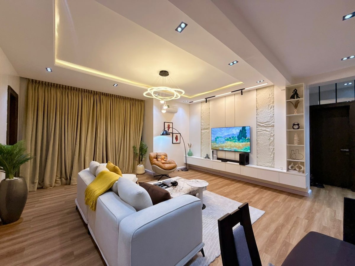 We’ve successfully combined that 5 star hotel feel with a home feel in this strikingly beautiful space. Newly refurbished,The bedroom is demarcated from the living room with pure mahogany wood profiles housing two embedded Tvs..You get your own private Sitting area, Ac, Refrigerator, 55 smart TVs. A spacious modern kitchen with 4 burner stove. The Bathroom comes with hot pressured water. Electricity is 24Hours! Security is 24/7. The wifi is super fast and ideal for working guests.