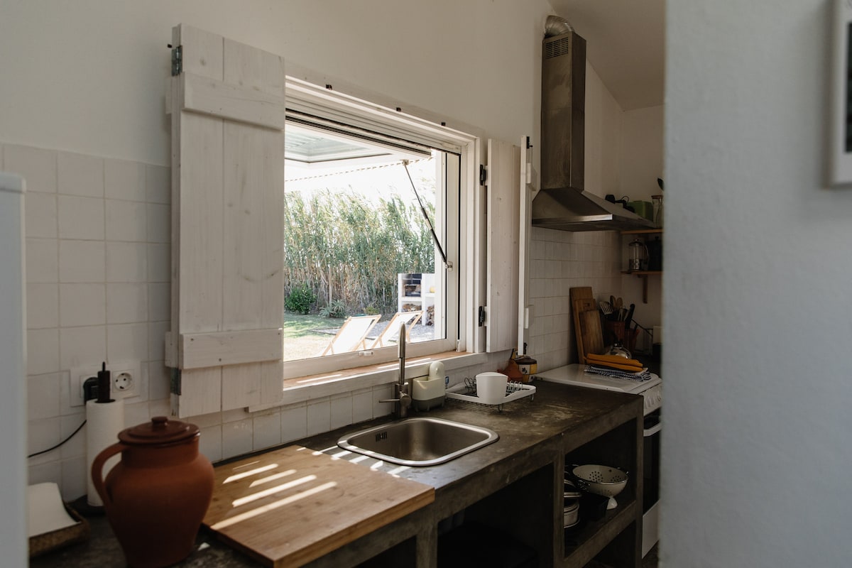 Relájate en este alojamiento único y tranquilo. La casa está llena de luz natural y emana una energía especial. La cocina tiene todo lo que tu corazón desea, y hay una lavandería para mayor comodidad. Un acogedor comedor promete deliciosas comidas. Como Portugal puede ser ventoso, el jardín está perfectamente situado en la parte posterior para protegerse de los vientos fríos, lo que permite la máxima relajación. Hay una ducha al aire libre disponible para refrescarse. La casa está a 5 minutos en coche de la playa.