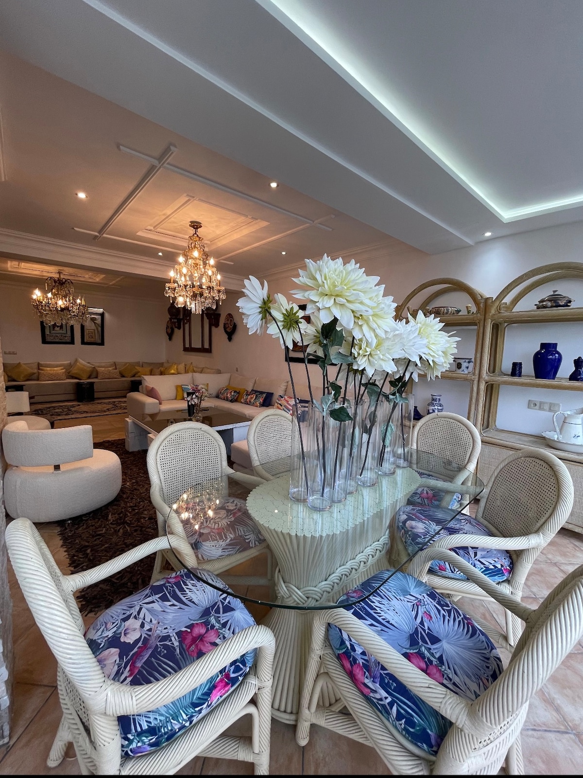 Villa de lujo con piscina grande privada auto-limpiante a 5 km de Cabo Negro y a 3 km del aeropuerto de Tétouan y McDonald’s. Con 2 habitaciones y 2 salones (uno con 4 sofás cama) para 7 adultos, cocina equipada, baño modernos, jardín con iluminación que se enciende al atardecer, zona de barbacoa y parking para 3 vehículos. Limpieza y mantenimiento garantizados. No se permiten fiestas , solo huéspedes respetuosos. Incluye climatizador automático