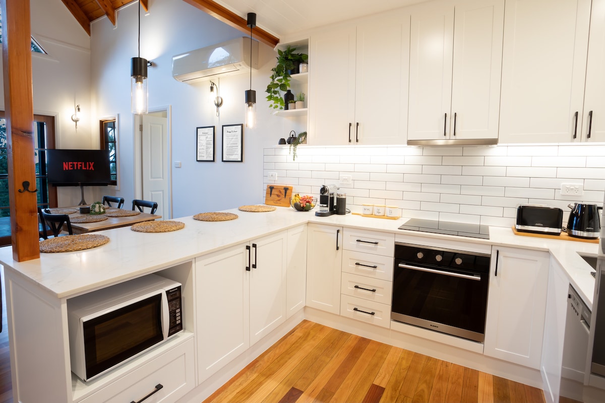 Lil' Birdsong greets you with a stylish decor and boasts all the amenities you need for a relaxing and rejuvenating stay. An unexpected oasis, surrounded by the peaceful sounds of native birds nearby and leafy views from the linen sheets. Take a soak in the bath under the stars, sing songs by the fire or enjoy a private infrared sauna with tree-lined views! The perfect couples retreat. Located perfectly between Lake Mac and Newys epic beaches, the ideal place to catch sunrise or sunset.