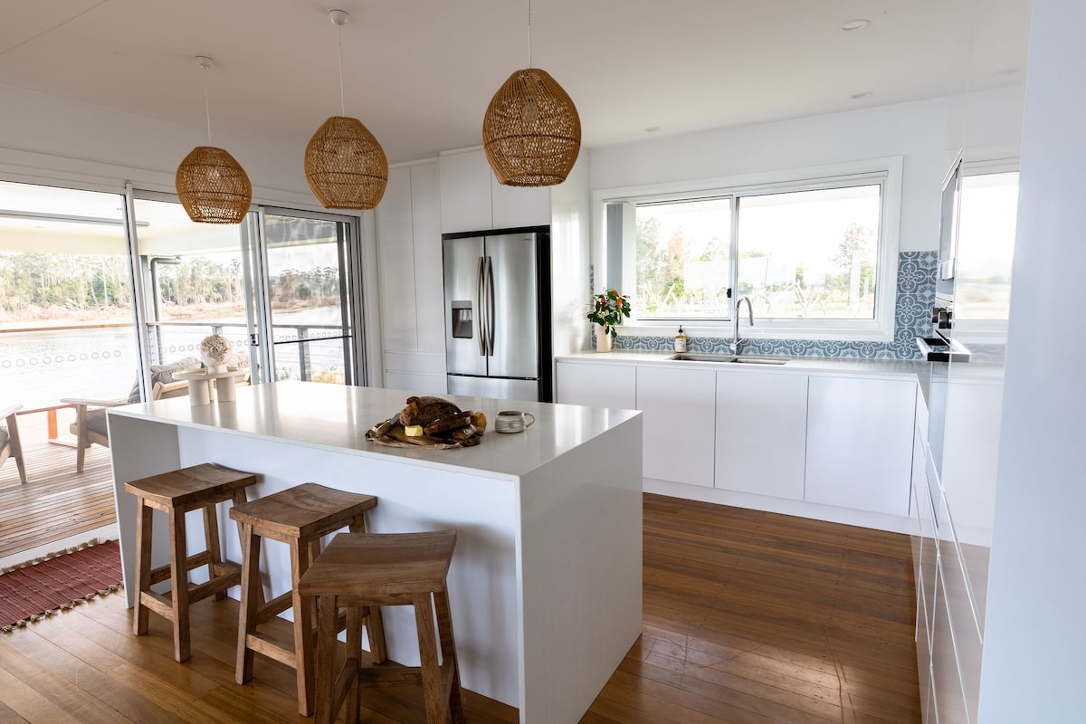 Luxurious eco tiny home in the heart of the Hunter Valley. This architecturally designed eco tiny home has everything you need for a well deserved break; privacy, amazing view of the Hunter River and surrounding bush land, queen Tempur Cloud bed and premium linen, air-conditioning, fully equipped kitchen, bathroom with eco-friendly toilet, living area with workspace, mini library, games, deck, outdoor bath, fairy lights, BBQ and fire pit.