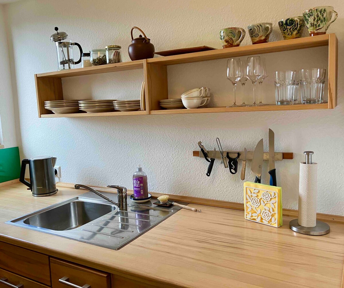 ¡Alojamiento exclusivo con estilo moderno! Ideal para solteros o parejas: disfruta de tu paz y disfruta de una escapada. - Esquí, senderismo, ciclismo, senderismo y mucho más. - Neckar y la Selva Negra picos justo afuera de la puerta. - Fitness y bienestar: sauna, mancuernas, HulaHoop, 2 bicicletas de montaña. - Cocina totalmente equipada con todos los adornos - Gran balcón soleado del suroeste. - Sala de estar (descanso o trabajo a distancia) - Calefacción por suelo radiante con un acogedor suelo de parqué de madera de roble. - Cafetera Nespresso - eCharging Wallbox