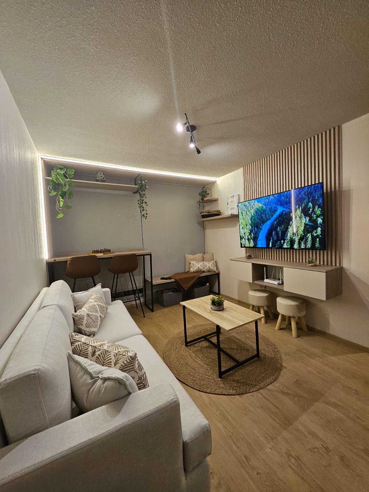 Disfruta de este alojamiento de estreno en Cayma, a 10 minutos del centro de Arequipa. Ubicado en un condominio seguro, ofrece gimnasio y sala de aeróbicos. La habitación cuenta con una cama queen, closet e implementos de calidad para un descanso ideal. El baño es completo y está perfectamente equipado. La sala y kitchenette, con tonos cálidos y un estilo moderno, brindan armonía y confort. Además, su balcón privado permite disfrutar de lindas vistas y del aire fresco de Arequipa