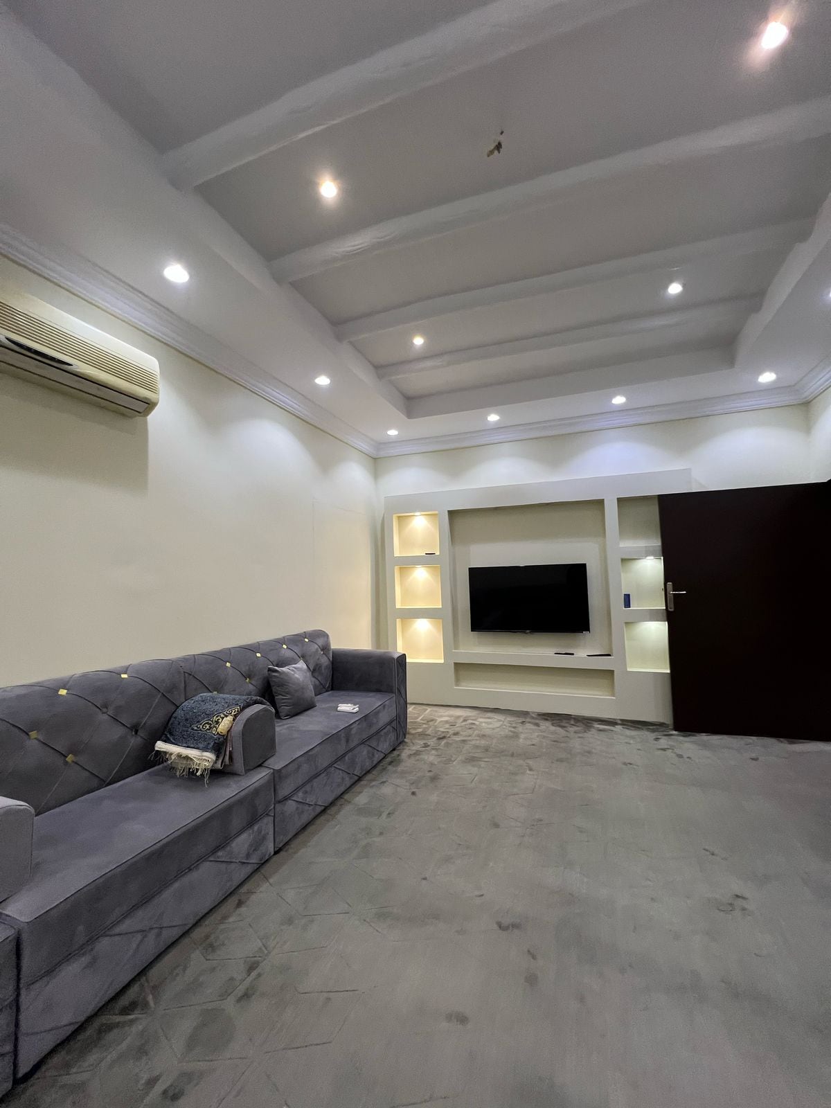 شقة أنيقة بتصميم عصري وألوان هادئة تتميز بصالة واسعة وكنب مريّح للاسترخاء يمنح المكان الراحة والفخامه