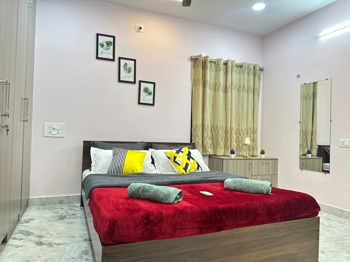 Welcome to your spacious 2-bedroom, 2-bathroom getaway in the heart of Vijayawada! Perfectly situated near the City Center, major attractions, shopping malls, and Capital City region, this elegant home offers the perfect blend of comfort, style, and convenience. Enjoy bright, airy interiors, cozy bedrooms, a fully equipped kitchen, and high-speed Wi-Fi. With easy transport access, it’s ideal for families, groups, and business travelers exploring vibrant NTR District.