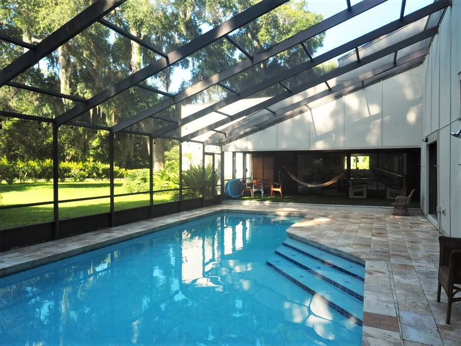 “Nestled on a serene 1/2 acre under the canopy of majestic live oaks, this beautifully renovated home is a hidden gem offering tranquility and charm. The full-size, screened-in pool provides a private oasis, perfect for refreshing swims from May to October. A shaded porch with a hammock invites you to relax and unwind. Located at the end of a quiet street in the heart of the island, this peaceful retreat is just one mile from pristine beaches and close to all of Amelia Island’s top attractions.”