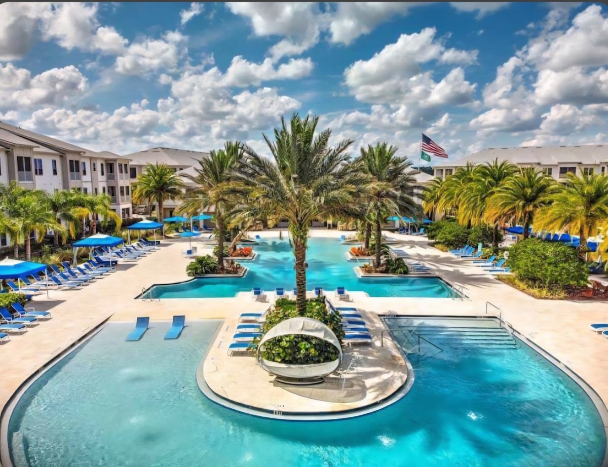 ¡Amplio departamento de 2 dormitorios y 2 baños a solo 10 minutos de Mayo Clinic y Town Center! Cada suite King tiene baño privado, vestidor y Smart TV. Disfrutá de wifi gratis, lavandería en la unidad y servicios completos de resort: pileta, gimnasio y más. Ubicado en un edificio seguro con ascensor y estacionamiento gratuito. Perfecto para estadías por tratamientos médicos o visitas prolongadas. Relajate con comodidad, explorá los restaurantes y tiendas cercanos o dirigite a la playa a solo 15 minutos. Fácil acceso a la I-295 hace que todo esté al alcance.