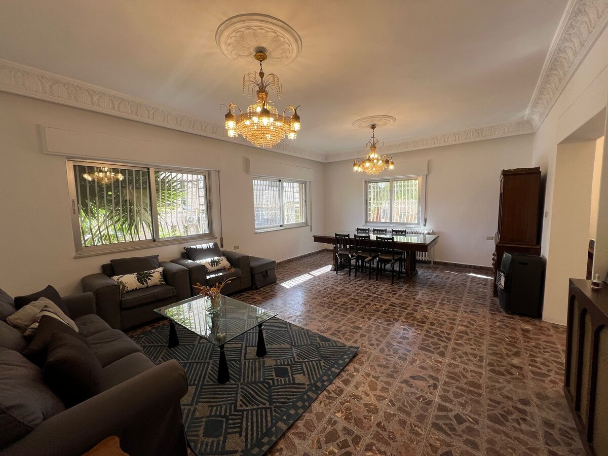 Disfrutá de un amplio departamento en una villa privada en Dabouq con su propia entrada y acceso total a un enorme jardín. Está completamente amueblada con antigüedades y detalles de Oriente Medio, y ofrece 1 dormitorio, 1,5 baños, varios salones y una biblioteca. Los anfitriones viven en el nivel superior y pueden usar la terraza de arriba, pero tu unidad y tu jardín son completamente privados. Cerca de cafés y restaurantes. Ideal para explorar o para estadías largas.
