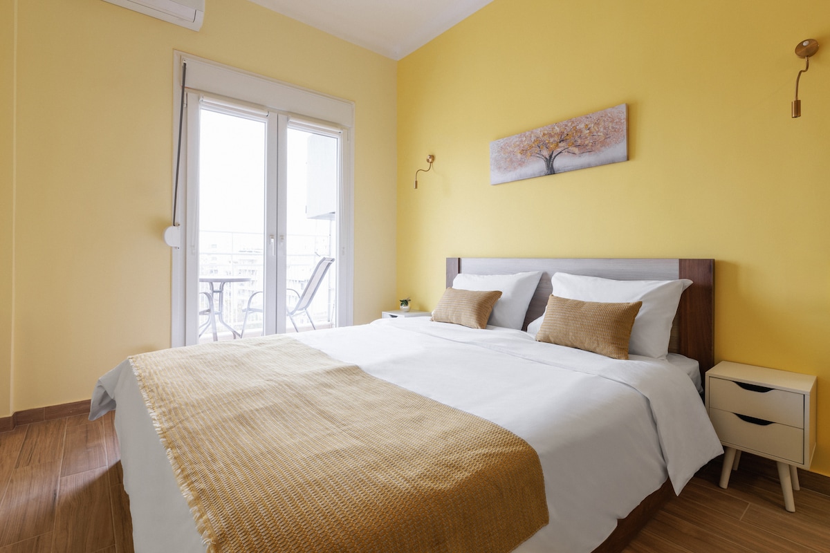 Unwind in this bright airy 65m2 apartment with soaring ceilings. Discover a peaceful 3 spaces escape right in the center city, next to Aristotelous square. Port, museums, restaurants, coffee shops, supermarkets are within walking distance! Enjoy our wifi Fiber Optic 100Mbps speed. Two aircondition units warm up the entire apartment and create a homely ambience to relax after a day visiting city sights.