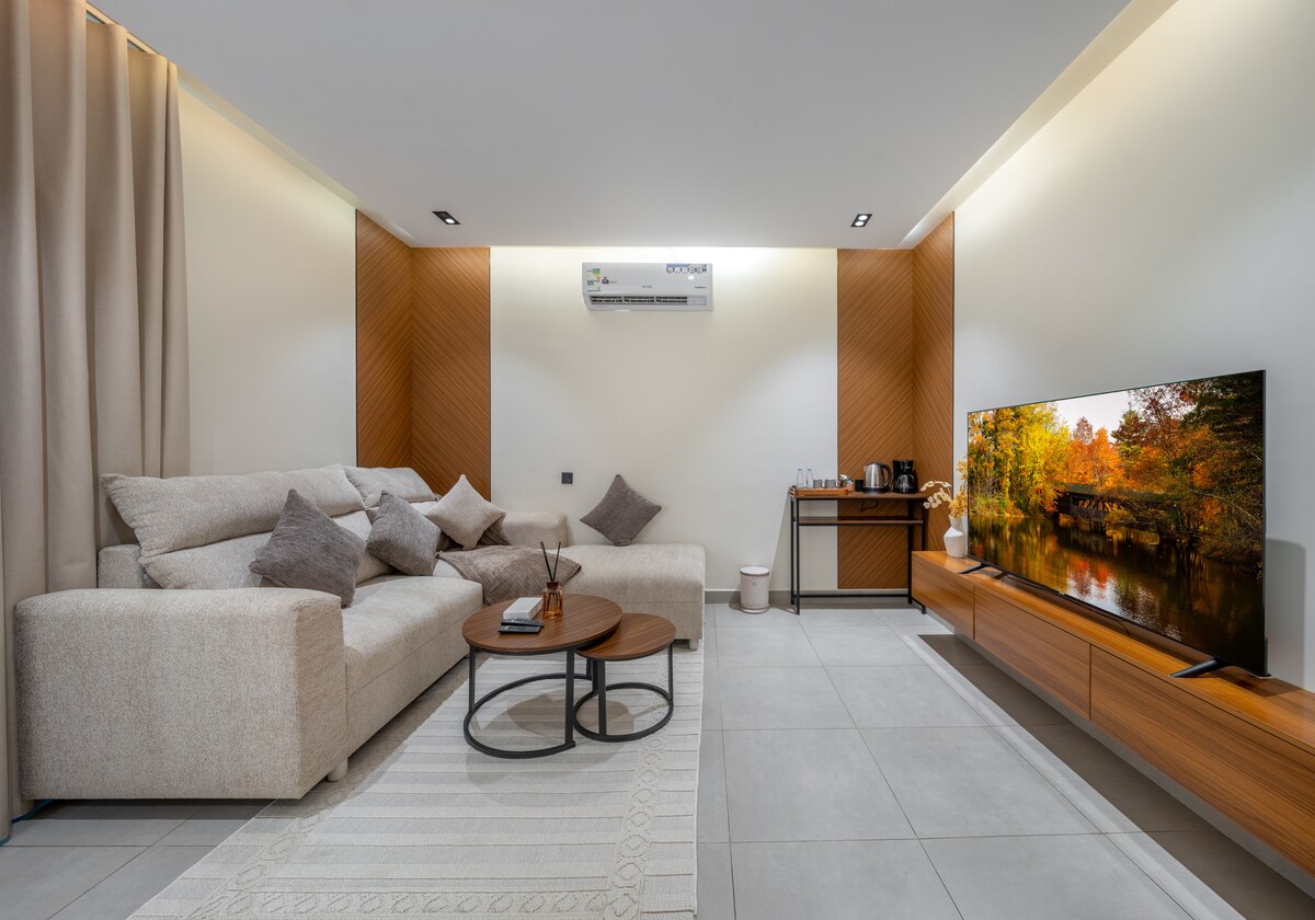 Apartamento de lujo al norte de Riad Diseñado para ser diferente y elegante con un jardín al aire libre, Tiene total privacidad y entrada automática . Ubicación estratégica 📍 Ubicado a una distancia : A 15 minutos en coche de la temporada de Riad.🌟 A 10 minutos del parque Riyadh. 🛍️ A 13 minutos del Centro Financiero King Abdullah. 🏙️ A 18 minutos del aeropuerto internacional King Khalid.🛫 Consta de una habitación americana, salón, cocina y jardín privado al aire libre.