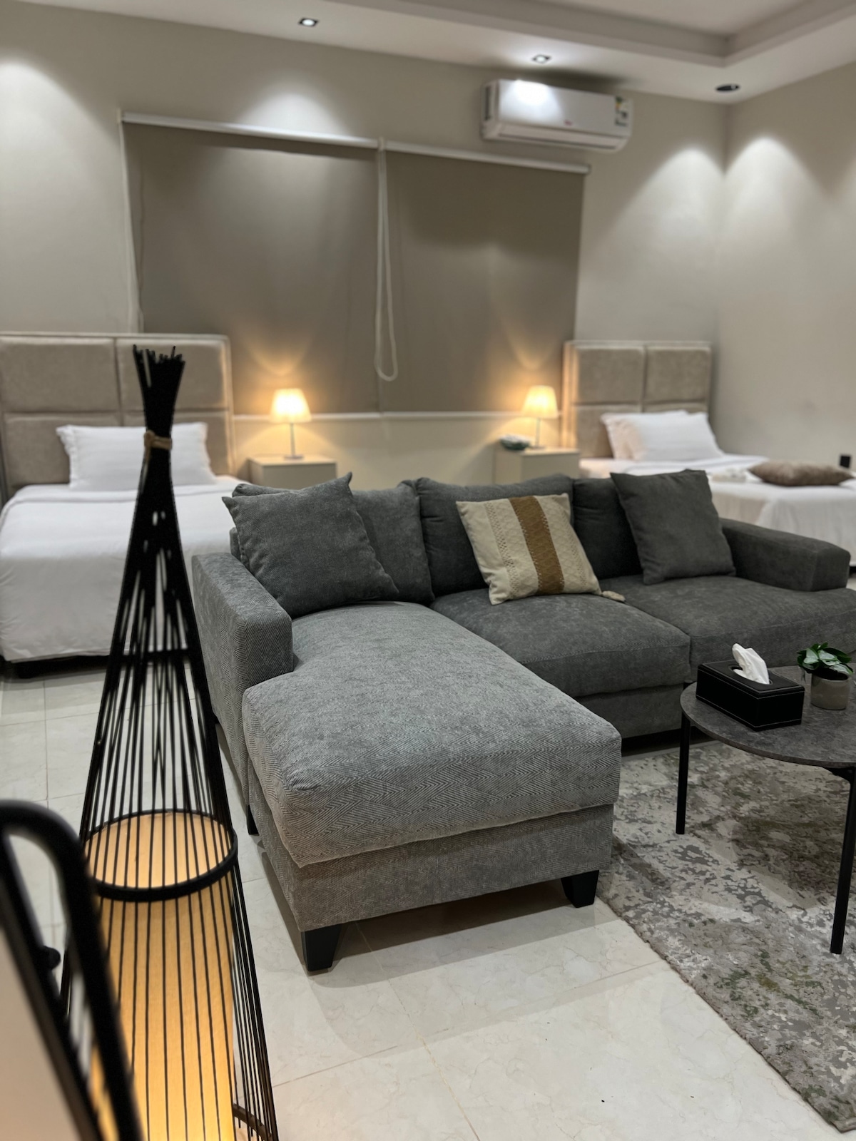 Nueva suite de lujo con bañera y zona de estar en un lugar tranquilo. • Auto check-in • Bañera • Zona de estar extra • WiFi • Colchón médico • Sofá cómodo premium • Parking en superficie • Amenidades de hotel • Cocina equipada • Lavadora • Ubicación: céntrica, a 1 km del Anillo Norte; 12 min aeropuerto; 15 min Distrito Financiero; 15–20 min Riyadh Season y Boulevard; 10–15 min Univ. Imam, Princess Nourah y SEU. • Nota: limpieza diaria estilo hotel en horarios convenientes.