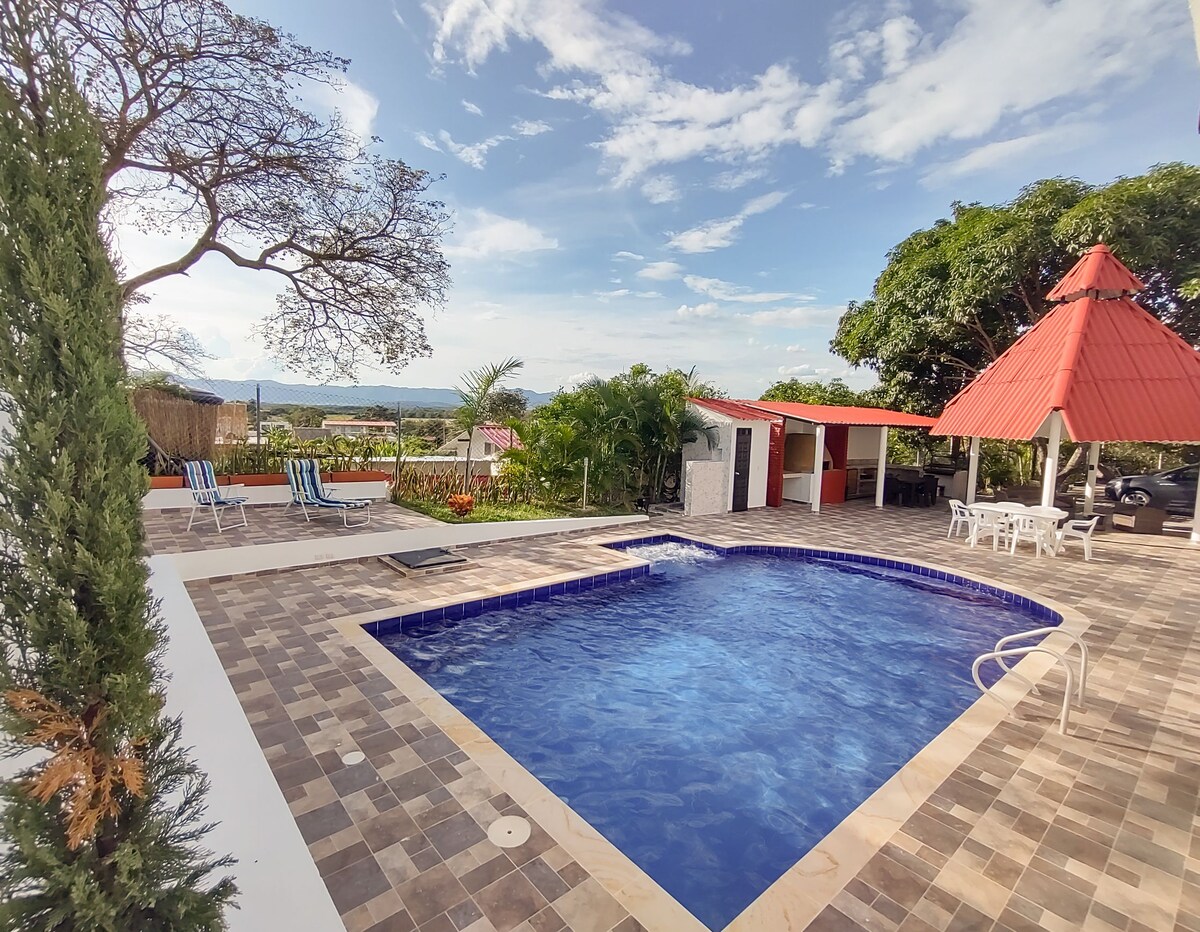 HERMOSA CASA CON PISCINA COMPLETAMENTE PRIVADA, para 14 personas en condominio cerrado, Internet Satélital -WIFI , TV con Direct Tv, amplios espacios con zona verde-jardín, parqueadero cubierto para 4 vehículos, 3 habitaciones con aire acondicionado para 4 personas c/u. Sala comedor y Cocina integral con aire acondicionado y utensilios ,congelador, tv en sala, zona de BBQ a carbón, se encuentra ubicada a 15 minutos de Melgar vía a Carmen de Apicala, El PRECIO FINAL INCLUYE IVA