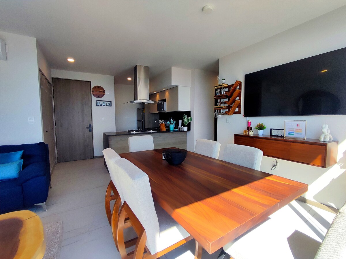 Espacio tranquilo, cómodo y elegante. Cuenta con smart TV con Netflix, Prime Video y YouTube, puedes disfrutar de las amenidades como alberca, gimnasio, Terrazas, asadores, fogateros, juegos infantiles etc Espacio de estacionamiento propio, bodega y elevadores. El centro comercial Andares y Landmark súper cerca, igual que el Tec de Monterrey, Flextronics y estadio Akron, rodeado de restaurantes y vida nocturna. Excelentes rutas para salidas a Puerto Vallarta, Tapalpa, Chapala y Manzanillo.
