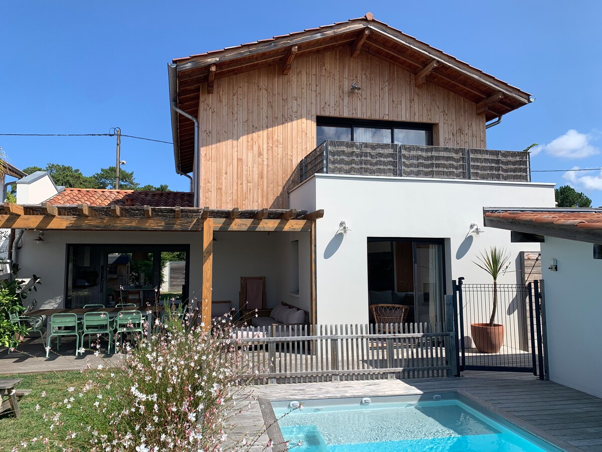 Au calme, idéalement placée dans un quartier recherché d'Anglet entre océan et forêt, agréable maison neuve moderne lumineuse tout confort avec PISCINE ET DOUCHE EXTERIEURE. Océan à 2km Forêt à 100m pour des balades à pied ou en vélo. Commerces (boulangerie, SPAR, laverie, restaurant, pharmacie, tabac,...) à 50m Bus à 50m qui dessert les plages, le centre ville de Bayonne et de Biarritz. Places de parking devant la maison.