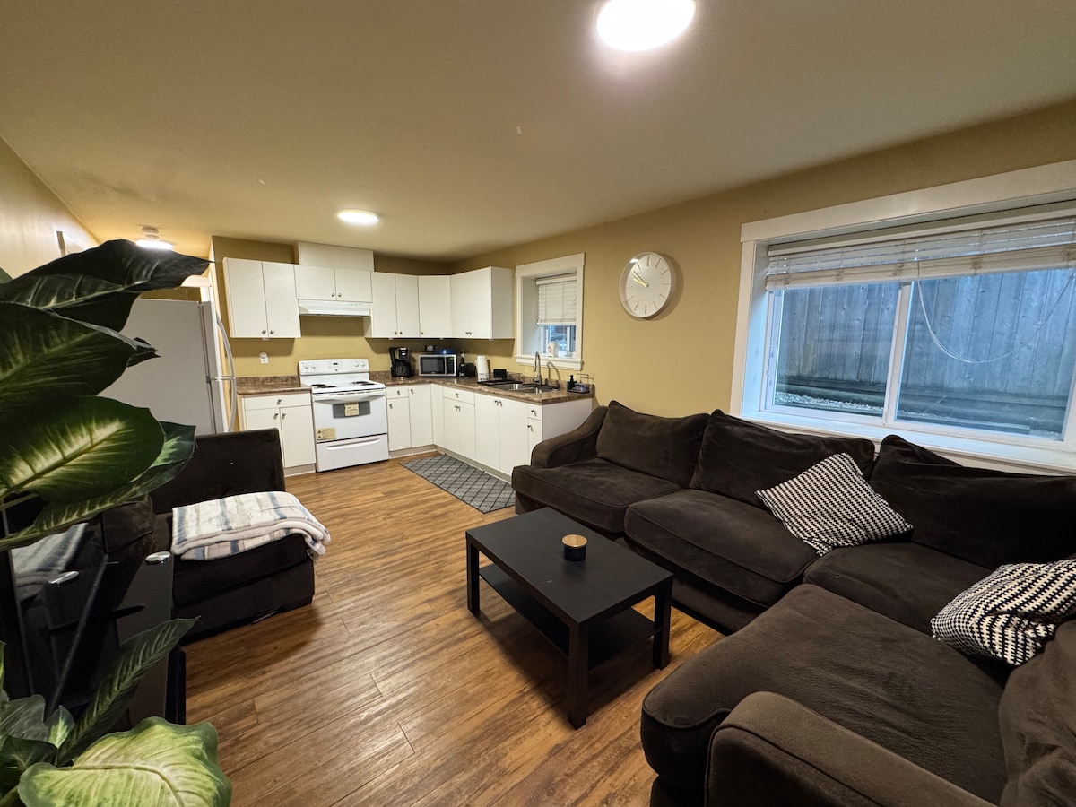 A cozy basement suite offers full kitchen, spacious dining and living room area, retro-modern bathroom. Sleep well on a queen bed with crisp white linens and heavenly pillows. Enjoy free wi-fi and watch your favourite Netflix movies in a huge TV with a warm electric fireplace. Morning coffee and bottles of water are complimentary! Located in a quiet neighbourhood where you can walk on nearby trails. 20 minutes drive from/to Tsawwassen Ferry terminal. 30 minutes drive from/to the YVR airport.