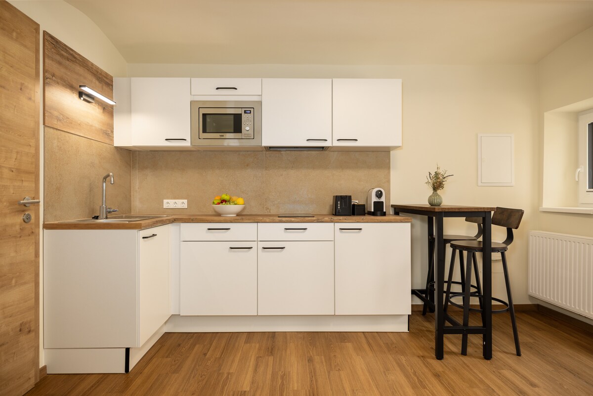Apartamento de 50m2 en 1er piso con 1 dormitorio con cama de matrimonio, gran cocina-cama-sala con sofá cama doble y estufa de pellets; un baño con bañera, calefacción por suelo radiante y vista a la Ottohaus/ Rax. Suelos de barco de 100 años de antigüedad, cómodos sofás y sillas de lectura, TV de pantalla plana con conexión vía satélite y reproductor de DVD, así como una selección de películas clásicas para las noches lluviosas. Acceso a la sauna y uso del jardín incluido.