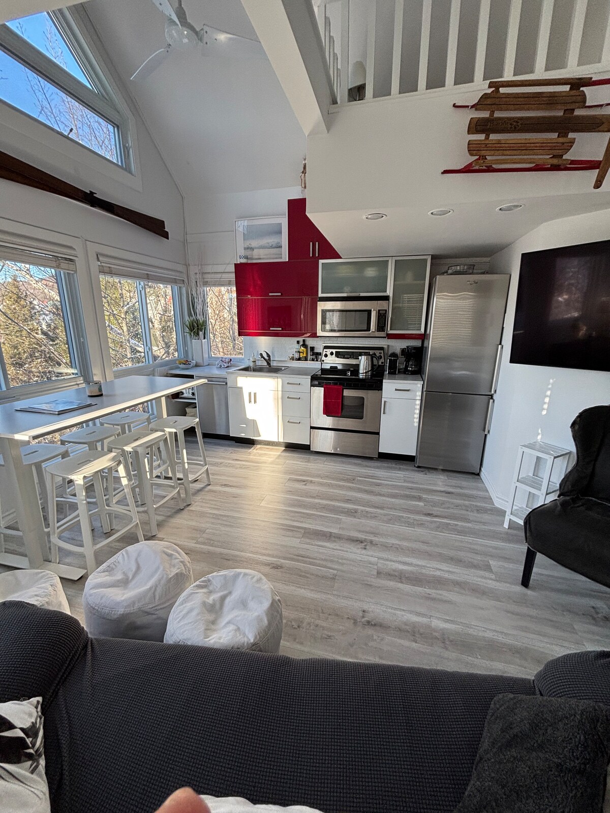Desconecta de la rutina en este alojamiento único y relajante. Situado directamente en la pendiente. EL MEJOR ACCESO DIRECTO A LAS PISTAS DE ESQUÍ EN TREMBLANT. Este apartamento de un dormitorio con aire acondicionado (cama tamaño queen) y chimenea de madera tiene capacidad para 4 personas y está bien equipado para dar la bienvenida a cualquier amante del aire libre. Para el acceso directo a las pistas de esquí, ten en cuenta que hay unos 50 escalones desde el apartamento hasta la pista de Chalumeau para empezar o volver de tu día de esquí. CITQ #295941