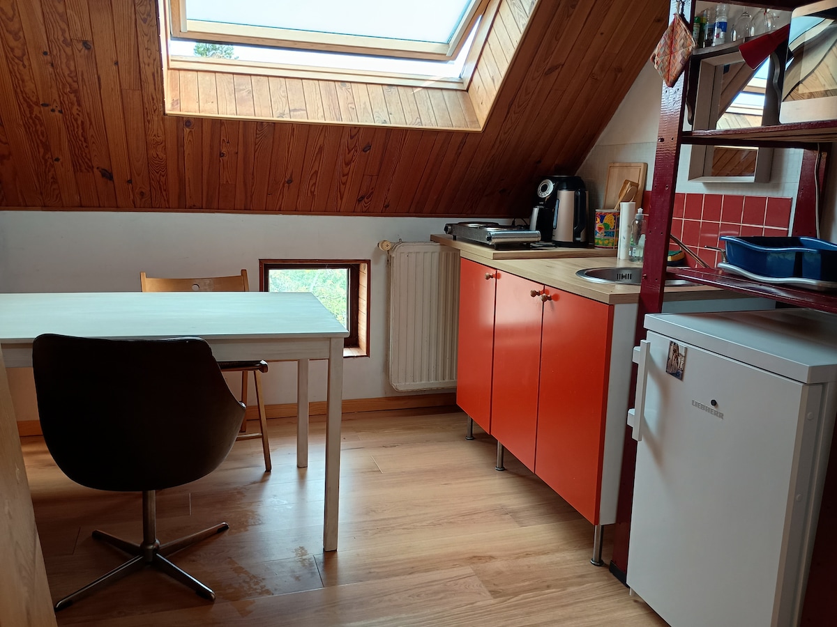 Escapá de la rutina diaria y disfrutá de la relajación y la naturaleza en nuestro acogedor estudio con sauna infrarroja privada, jacuzzi y terraza espaciosa. Perfecto para un fin de semana romántico o una estadía relajante con la familia o los amigos. El estudio se encuentra en un gran jardín paisajístico con animales. Aunque hay varios alojamientos en la propiedad, todos disfrutan de privacidad gracias al tamaño del jardín y la vegetación. ¡Perfecto para parejas y también para familias!