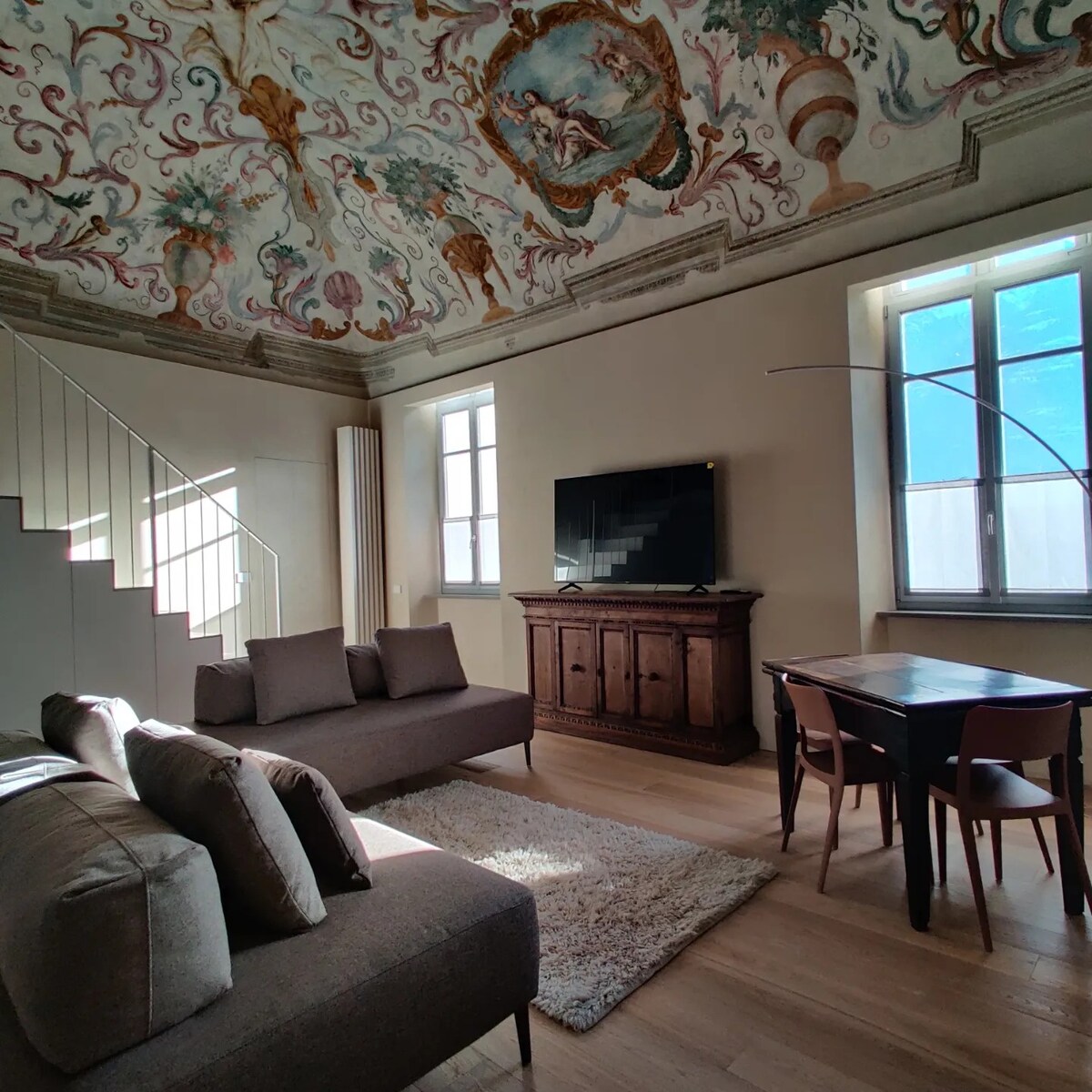 Vivi Aosta, esplora la Valle. Nel cuore di Aosta, al piano nobile del seicentesco Palais Ansermin, sorge questa dimora storica, un tempo residenza dei baroni di Nus. Il soffitto a volta affrescato, riportato alla luce da un attento restauro, dona un’atmosfera unica e affascinante. Curata in ogni dettaglio, unisce comfort moderno e charme antico. Ideale per chi desidera visitare Aosta e la Valle d’Aosta, e godere di tutto ciò che la regione ha da offrire: cultura, natura, sport e sapori locali.