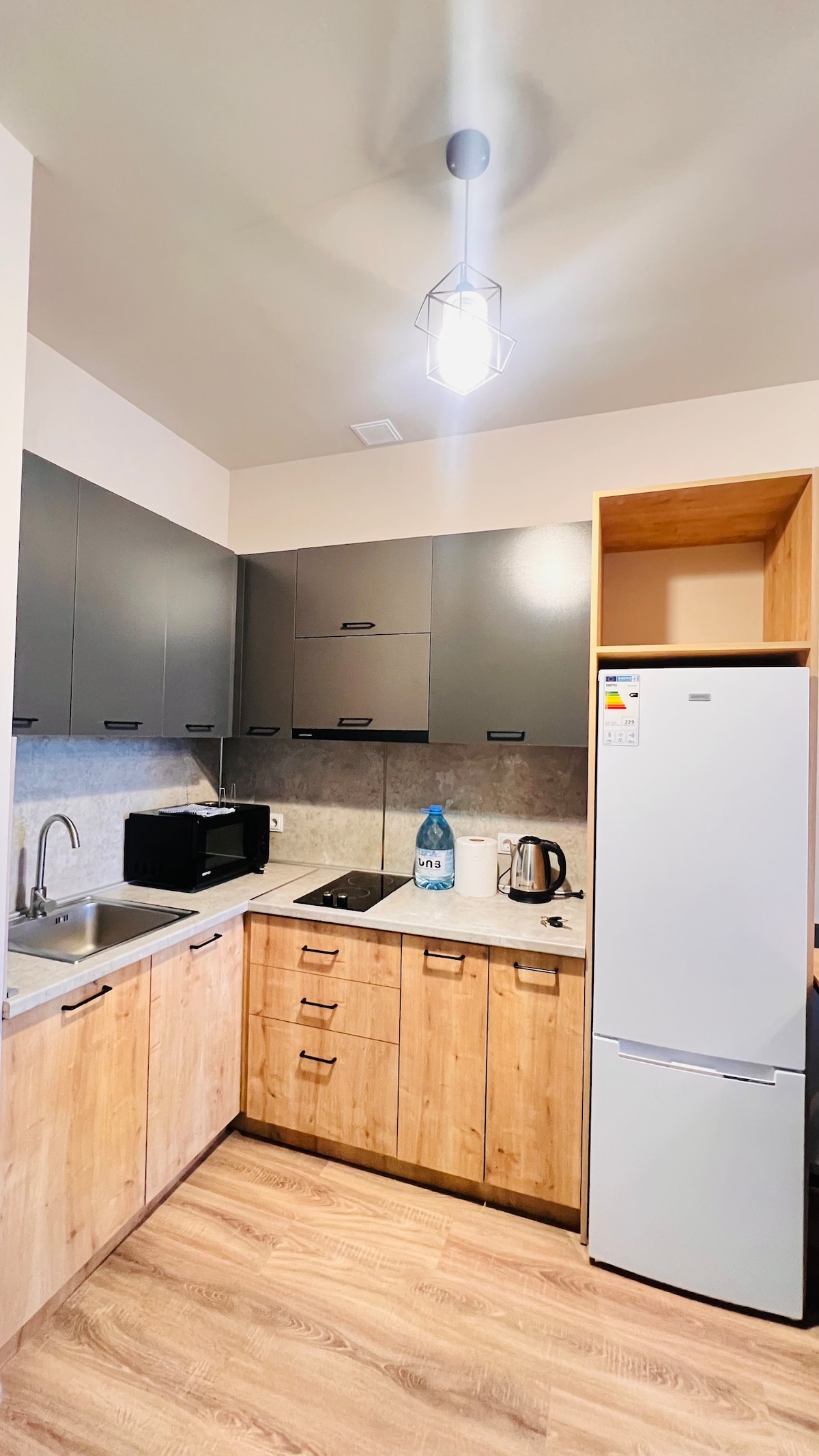 Un acogedor apartamento tipo estudio, con todas las comodidades: cómoda cama tamaño queen, cocina bien equipada, sofá plegable. Ideal para 2 adultos y 2 niños, o 3 adultos. Tiene calefacción y refrigeración centrales. Balcón francés. Hay una piscina y saunas en la primera planta del edificio.