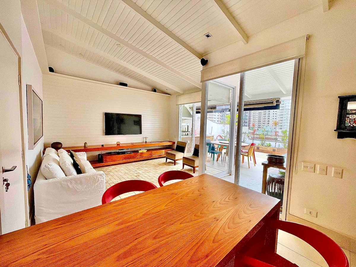 Para Año Nuevo y Carnaval, mínimo 5 noches. ¡Maravilloso ático con todas las comodidades para una estancia de lujo! ¡El empleado se puede contratar durante 8 horas de servicio diario! El condominio es extremadamente seguro y une la playa (privada) con un aspecto forestal. En la playa Sorocotuba, tendrás tus sombrillas y sillas reservadas para ti, así como duchas, baños y un snack bar. El condominio tiene una piscina al aire libre, parque infantil, cancha de squash. No aceptamos mascotas