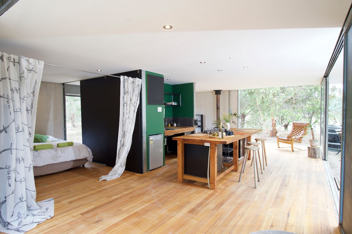 Diseñada por el galardonado arquitecto Simone Koch, la cabaña se trata de cocinar, comer, beber vino mientras se puede abrir hasta el hermoso arbusto australiano... El inodoro es un sistema orgánico al aire libre (basado en los inodoros del parque nacional). Situado al comienzo de la Great Ocean Road, a solo diez minutos de Torquay o de la famosa Bells Beach. Botella complementaria de pinot de la bodega a la llegada. Proporcione su propia leña de fuego.