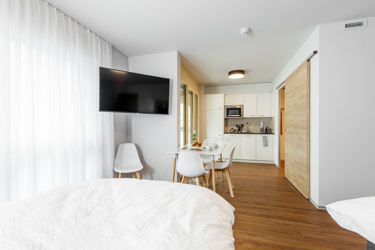 1 – Zimmer-Studio B U D G E T Preiswert, aber trotzdem mit allem ausgestattet, was ein Zuhause ausmacht. - Küchennische mit Mikrowelle, Kaffeemaschine, Wasserkocher, Kühlschrank mit Gefrierfach – ohne Herdplatte - kleiner Wohnbereich mit Tisch & 2 Stühlen - grosszügiges Bad mit Regendusche & Fön - Boxspringbett - Smart-TV / eigener Accesspoint - Balkon oder Loggia mit kleinem Tisch & Stühlen Genieße ein stilvolles Erlebnis in dieser zentral gelegenen Unterkunft.