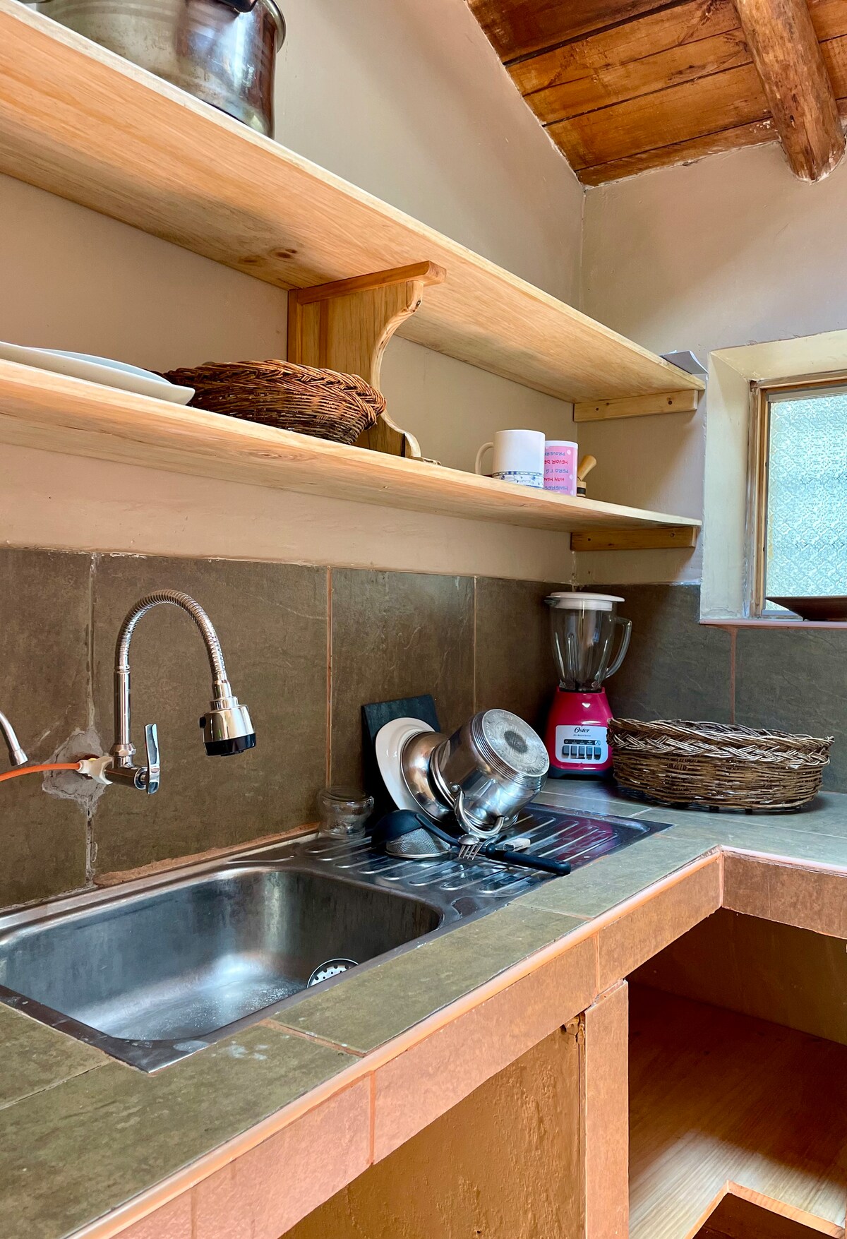 Pequeño departamento en medio de una huerta de frutas y flores; con todo lo necesario para una estancia cómoda. Área total: 45 m2, piso y medio de construcción. Primer Piso: sala, cocina y baño (agua caliente en la ducha con terma a gas). Segundo piso: habitación y un balcón con vista a las montañas. Acabados en arcilla, piedra, madera y cerámicos. Ventanas amplias, así como un tragaluz en el techo proveen de luz natural durante todo el día. Pd. Se puede recoger a los huespedes desde Cusco (aeropuerto u hotel) en nuestra movilidad y llevarlos a la casa en Urubamba por una tarifa adicional. Consultar
