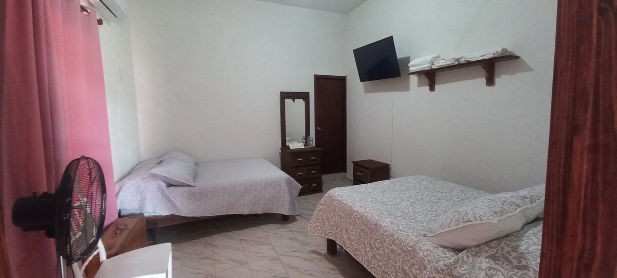 Departamento ubicado en planta baja, completamente amueblado: sala, comedor, cocina. Dos recámaras, cada una con una cama matrimonial y una individual. Sofá cama en la sala. Dos baños completos. 1 privado.Aire acondicionado, en recámaras y sala comedor.pantalla led, Wifi. Ubicado a 2 cuadras del centro de la ciudad. Pregunta por disponibilidad de un segundo departamento en planta alta.